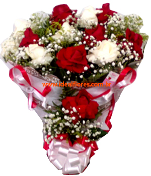 Lindo Buquê com 12 Rosas, sendo 6 Vermelhas e 6 Brancas, decoração especial, celofane duplo, e laços.